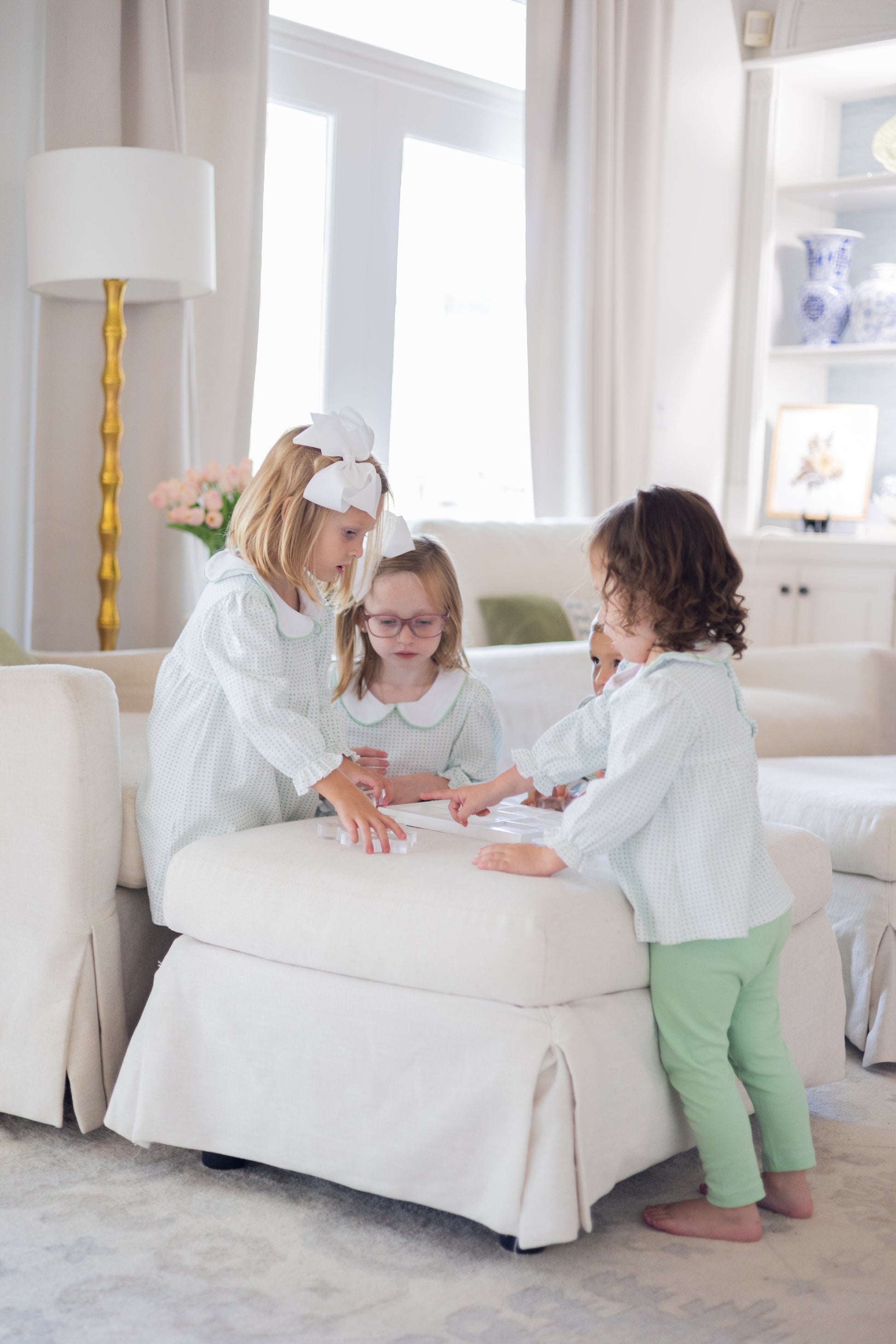 Such a sweet collection! Our green dot long sleeve Peter Pan collar tunic legging set with the ruffle sleeve detail are to die for. These are 100% cotton and makes the perfect go-to outfit for play, school, or special occasions. We are all about versatility because these are perfect for Mardi Gras, St. Patrick's Day, Easter, and well into the spring! Runs TTS