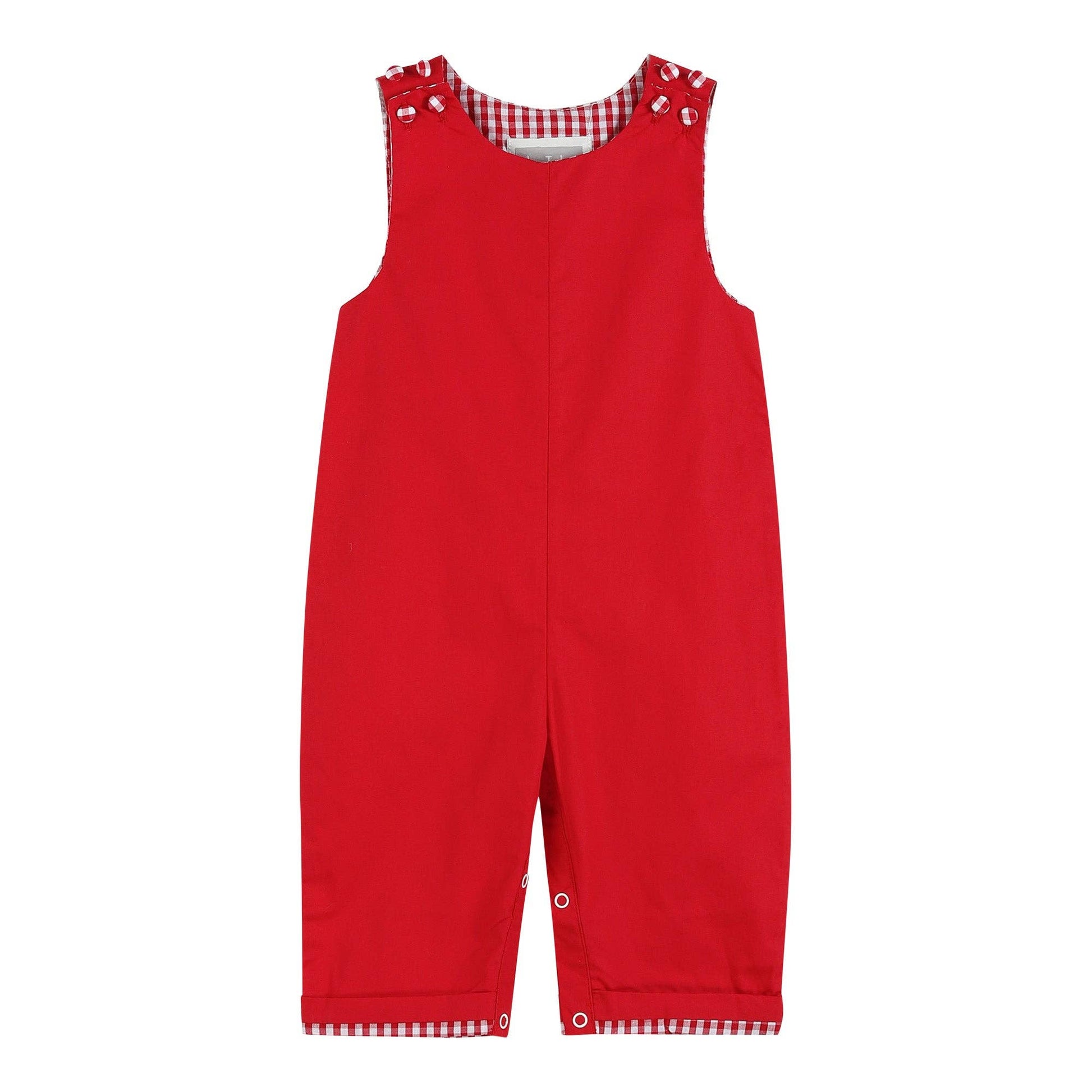 These comfy and cute overalls are perfect for every day or even use them as a blank for custom embroidery or monogram. Perfect for Gameday or even Christmas! It is lightweight in bright red 100% cotton with red gingham trim. Fully lined. Two adjustable fabric-covered buttons and snaps at the crotch for easy changing.